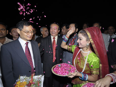 An Indian woman in national dress strews pink petals, giving a warm welcome as the Beijing Olympic torch relay delegations arrive in the airport of New Delhi, India, April 17. The torch relay in New Delhi is due to begin on Thursday. [Xinhua]