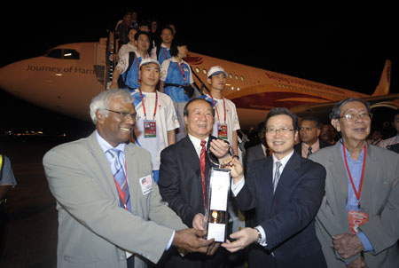 Upon arrival at the airport, Jiang and the flame received a warm welcome by a cheering crowd, among whom are Deputy president of the Olympic Council of Malaysia (OCM) M. Jegathesan and OCM honorary secretary Sieh Kok Chi.