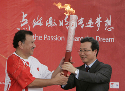 Cheng Yonghua (R), China's ambassador to Malaysia, passes the Beijing Olympic 2008 torch to the first Malaysian torchbearer, President of Olympic Council of Malaysia Tunku Imran Tuanku Ja'afar, in Kuala Lumpur April 21, 2008. [Agencies]
