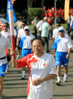 Torchbearer Lan Lijun, Chinese Ambassador to Indonesia, runs with the Olympic torch during the torch relay in Jakarta, capital of Indonesia, April 22, 2008. [Xinhua]