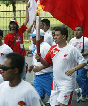Indonesian badminton player and Olympic gold medallist Alan Budi Kusuma runs with the Olympic torch during the Beijing Olympic torch relay in Jakarta April 22, 2008. [Agencies]