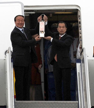 The flame lantern was carried off the plane by Jiang Xiaoyu, Vice President of Beijing Organizing Committee of Olympic Games and Chinese ambassador Zhang Junsai.
