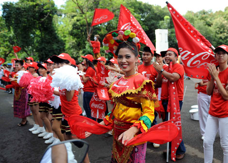 Local people in national dress perform a traditional dance along the street during the Beijing Olympic torch relay in Jakarta April 22, 2008. [Xinhua]