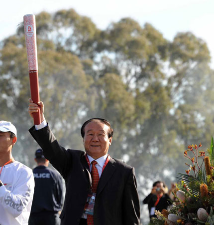 Jiang Xiaoyu, Executive Vice President of the Beijing Organizing Committee for the Games, holds the Beijing Olympic torch before the start of the torch relay in Canberra, Australia, April 24, 2008. The 15th leg of the global Olympic flame journey concluded Thursday noon local time as scheduled without major disruptions. [Xinhua] |