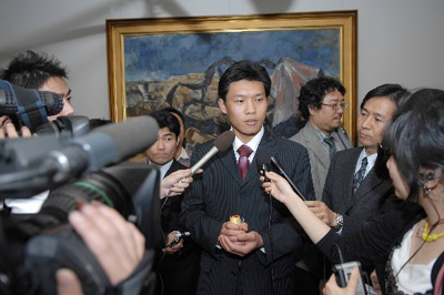 Zhang Bi (C), a Chinese student who will take part in the relay on behalf of 100,000 Chinese students in Japan, receives interview in Nagano, the 16th leg of overseas Olympic torch relay, on Friday, April 25, 2008. [Xinhua]
