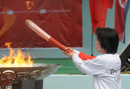 The last torchbearer Chong Song Ok kindles the Olympic cauldron with the flame after the torch relay in Pyongyang, capital of DPRK, April 28, 2008. [Xinhua]