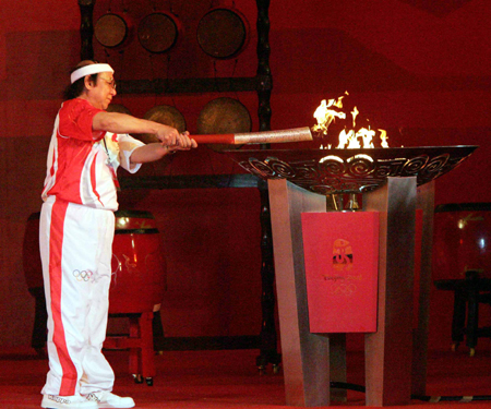 Nguyen Danh Thai, chairman of Vietnam's Olympic Committee who ran as the last torch bearer, lights the cauldron after the Olympic torch relay in Ho Chi Minh City, Vietnam, April 29, 2008. [Xinhua]