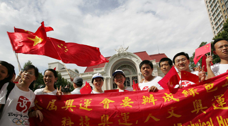 Overseas Chinese in Vietnam wave the national flags of the two countries to welcome the Olympic Flame in Ho Chi Minh City, Vietnam, April 29, 2008. [Xinhua]