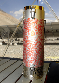 The specially designed Olympic flame lantern that climbers will carry the Olympic flame in to the summit of Mount Everest, also known as Qomolangma, is seen at Everest Base Camp, April 30, 2008. [Xinhua]