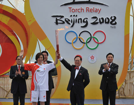 "Today, the Olympic torch relay resumes on Chinese soil after its global journey across five continents. It is a great and solemn honor for Hong Kong, Asia's world city, to be the first city in China to welcome back the Olympic flame on behalf of our proud nation," said Donald Tsang, chief executive of the Hong Kong Special Administrative Region, before he handed the first torch to Lee.
