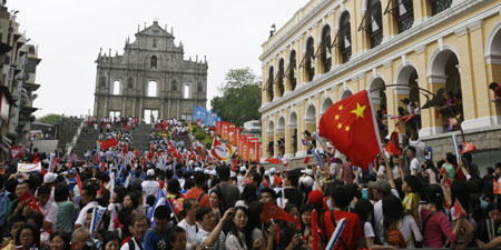 Spectators cheer as they wait to watch the Beijing Olympic torch relay at the Ruins of St Paul's in Macao May 3, 2008. [Agencies]