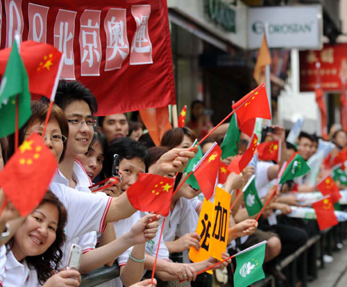 Macao residents wave Chinese flags and Macao SAR flags as they watch the 2008 Beijing Olympic torch relay in Macao May 3, 2008. [Xinhua]