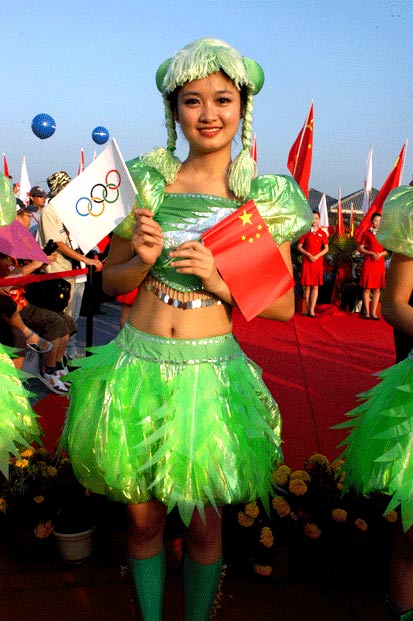 Haikou beauty waves the Chinese and Olympic flags together on Haikou's West Coast beach at the crack of dawn, May 6, 2008. Hot air balloons, roller blading flag waving youngsters, naval ships, countless camera crews, army trucks with cheering locals and seemingly thousands of students lined the streets Tuesday morning at the crack of dawn to give a joyous welcome to the Olympic Torch arrival to Haikou city, capital of Hainan province, South China. [chinadaily.com.cn/Brendan John Worrell]