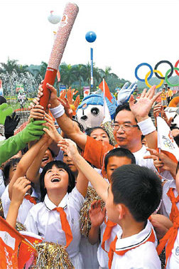 A torchbearer shares the joy with school kids during the relay in Guangzhou yesterday. [Xinhua]
