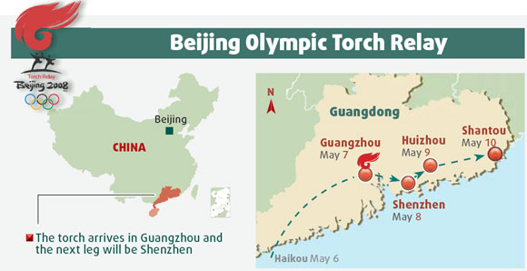 GUANGZHOU - This southern metropolis is widely called the "City of Five Rams (yang cheng) because of its legendary association with the horned animal. But yesterday, local student Huang Wenguang discovered something very auspicious about the torch relay route.
