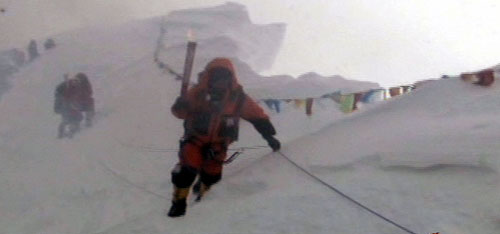 A TV grab shows Chinese climbers carrying the Olympic flame scale the summit of Mt. Qomolangma on Thursday morning. The torch arrived at the summit at around 09:17. [Xinhua]