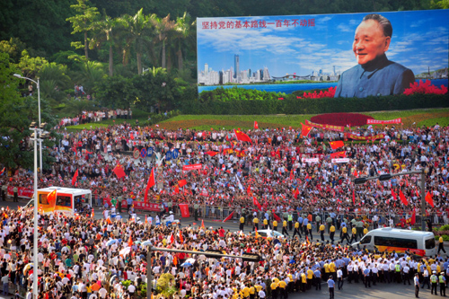 Onlookers greet a torchbearer in front of a portrait of the late paramount leader Deng Xiaoping in Shenzhen, South China's Guangdong Province, May 8, 2008. More than 3 million local residents flocked to the streets in support of the torch relay and the upcoming Beijing Olympics. [Xinhua]