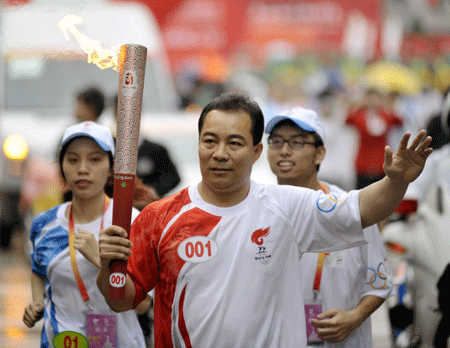 The first torchbearer Cai Yanshu runs with the Olympic torch during the torch relay in Shantou South China’s Guangdong Province, May 10, 2008. [Xinhua]