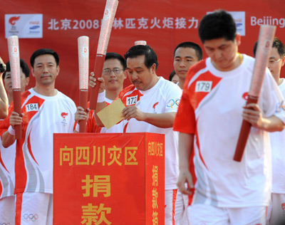 A torchbearer (C) puts money into a donation box while attending an event to contribute to quake-hit areas in Longyan, East China's Fujian Province, May 13, 2008. The Olympic torch relay continued its planned route in Fujian Province on Tuesday after a 7.8 magnitude earthquake jolted Southwest China's Sichuan Province Monday, leaving nearly 12,000 dead. [Xinhua]