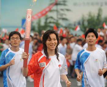 Former badminton world champion Ge Fei runs a leg of torch relay in Nantong on May 25, 2008. [BOCOG]