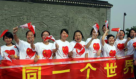 Local students celebrate the Beijing Olympic torch relay in Yueyang. The Olympic torch relay of Yueyang leg kicks off on Tuesday June 3, 2008 in Yueyang, central China's Hunan Province.