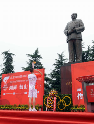 Jiang Aibing, the last torchbearer, salutes to a statue featuring late Chinese Chairman Mao Zedong during the torch relay in Mao's hometown Xiangtan, Central China's Hunan Province, June 5, 2008. [Xinhua]