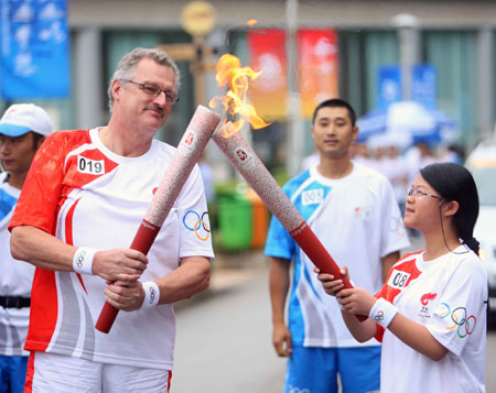 Two torchbearers, one from German and the other from the Yao ethnic group, pass flame during the Beijing Olympic torch relay in Kunming, Yunnan Province, June 9, 2008. [Xinhua] |