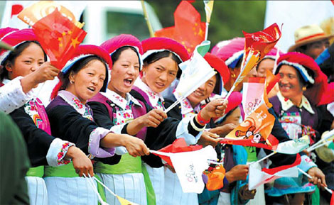 Ethnic inhabitants of Shangrila, Yunnan province, cheer for the torch relay June 11. [Xinhua] |