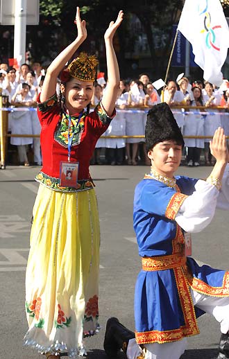 Local residents perform a traditional Xinjiang ethnic dance Tuesday during the Beijing Olympic torch relay in Urumqi, capital of the Xinjiang Uygur autonomous region. [Xinhua]