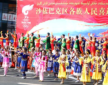 Local residents perform a traditional Xinjiang ethnic dance Tuesday during the Beijing Olympic torch relay in Urumqi, capital of the Xinjiang Uygur autonomous region. [Xinhua]