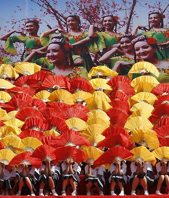 Local residents perform during the closing ceremony of the Beijing Olympic torch relay in Kashgar, Xinjiang Uygur autonomous region, June 18, 2008. The Olympic torch was paraded on Wednesday through China's former Silk Road city of Kashgar. [Agencies]