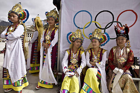 Ethnic Tibetan dancers wait to perform during the Olympic torch relay outside the Potala palace in Lhasa, Tibet autonomous region June 21, 2008. At the end of the relay, the "Qomolangma flame" will be reunited with the main flame, after which the torch will travel to Qinghai province, on Saturday night. [Agencies]