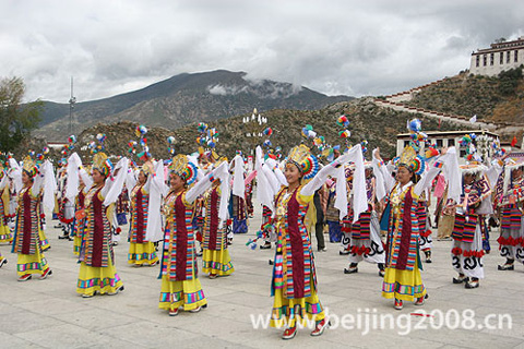 Local dancers perform a Tibetan ethnic dance to welcome the Olympic flame in front of the Potala Palace during the Beijing Olympic torch relay in Lhasa, capital of Southwest China's Tibet Autonomous Region, on June 21, 2008. [BOCOG]