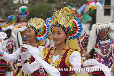Local dancers perform a Tibetan ethnic dance to welcome the Olympic flame in front of the Potala Palace during the Beijing Olympic torch relay in Lhasa, capital of Southwest China's Tibet Autonomous Region, on June 21, 2008. [BOCOG]
