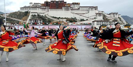 Local dancers perform a Tibetan ethnic dance to welcome the Olympic flame in front of the Potala Palace during the Beijing Olympic torch relay in Lhasa, capital of Southwest China's Tibet Autonomous Region, on June 21, 2008. At the end of the relay, the "Qomolangma flame" will be reunited with the main flame, after which the torch will travel to Qinghai province, on Saturday night. [Xinhua]