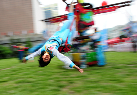 A local performer from the Tu ethnic group performs a tradional Chinese sports event during the Beijing Olympic torch relay in Xining, capital of Qinghai Province, June 24, 2008. [Xinhua]