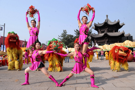 Local residents perform a folk dance before the Beijing Olympic torch starts its relay in Taiyuan, Shanxi Province, June 26, 2008. [Xinhua]