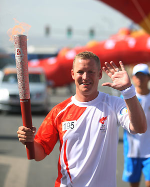 A foreigner waves to the crowd as he holds the Beijing Olympic torch during its relay in Zhongwei, Ningxia Hui Autonomous Region, on June 29, 2008. [Xinhua] |