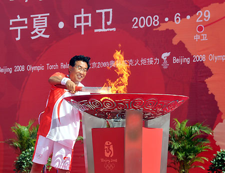 Last torchbearer Liu Chongxin kindles the cauldron during the Beijing Olympic torch relay in Zhongwei, Ningxia Hui Autonomous Region, June 29 ,2008. [Xinhua] |