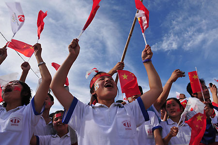 Local students give a warm welcome during the Beijing Olympic torch relay in Zhongwei, Ningxia Hui Autonomous Region, June 29 ,2008. [Xinhua] |