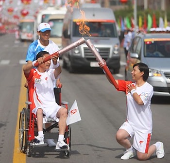 The flame is passed during the Beijing Olympic torch relay in Wuzhong, Ningxia Hui Autonomous Region, June 30, 2008. [Xinhua]