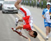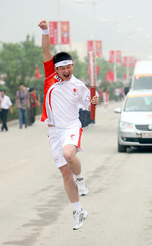 Olympic torchbearer Chen Xin jumps during the Beijing Olympic torch relay in Yan'an, July 2, 2008. [Xinhua]