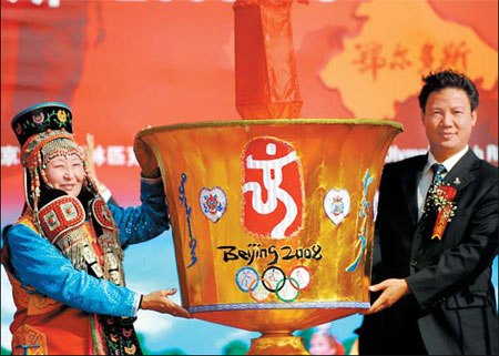 Mongolian woman Erden Qiqige gives a handmade embroidered lantern to BOCOG official Lin Xiaohua in Ordos yesterday. [China Daily]