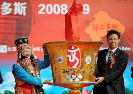A Mongolian woman presents a handmade Olympic torch to an Olympic official during the torch relay in Erdos, Inner Mongolia Autonomous Region of China, July 9, 2008. [Xinhua]