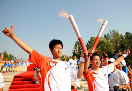 Torchbearer Li Ji (R) passes the flame to another Torchbearer Wang Heng (L) during the Beijing Olympic torch relay in Erdos, Inner Mongolia Autonomous Region of China July 9, 2008. [Xinhua]