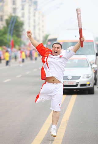 Torchbearer Guo Hongzhi jumps with joy during the Beijing Olympic torch relay in Chifeng, Inner Mongolia Autonomous Region of China, July 10, 2008. [Xinhua]