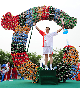 Torchbearer Yu Jianshe holds up the Olympic torch in front of a sculpture made from Fuwa dolls during the Olympic torch relay in Chifeng, Inner Mongolia Autonomous Region of China, July 10, 2008. [Xinhua]