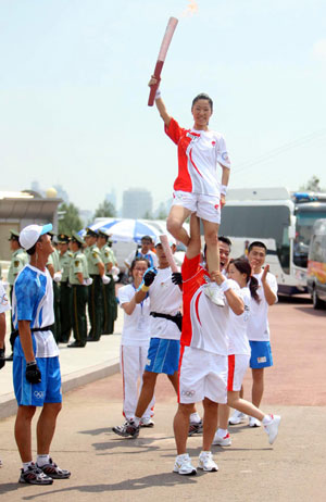 Torchbear Zhong Hongbo upholds his partner Shen Xue as if they were figure skating during the Beijing Olympic Torch Relay in Harbin, Heilongjiang Province, July 11, 2008. [Xinhua]