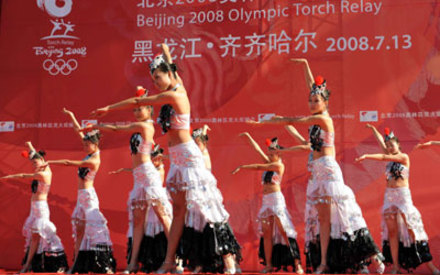 Dancers perform at the starting ceremony for the Beijing Olympic torch relay in Qiqihar, Heilongjiang Province, July 13, 2008. [Xinhua]