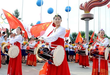 Dancers celebrate the torch's arrival during the Changchun leg in Jilin province on July 14,2008. [Xinhua]